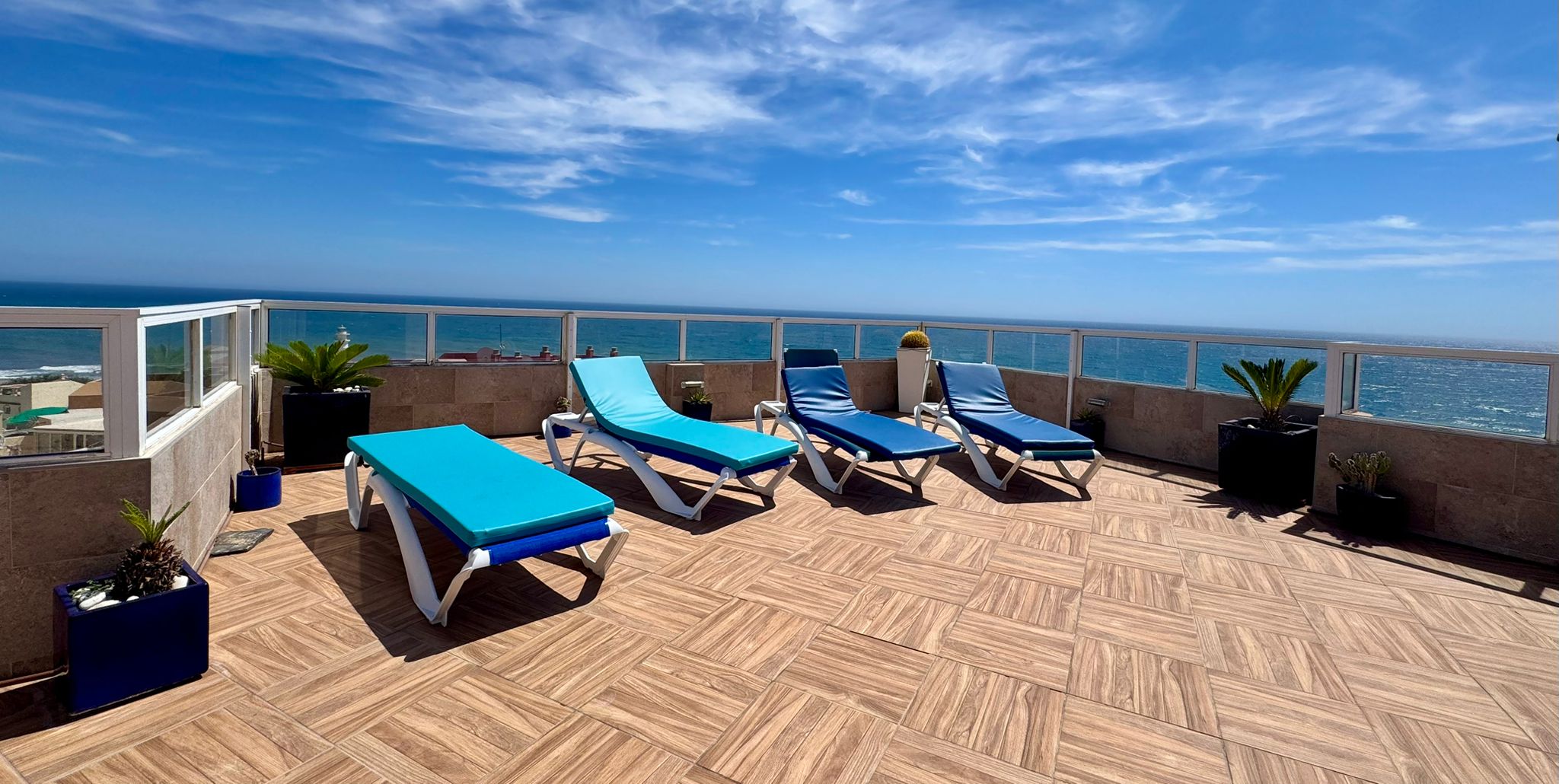 Slechts 75 meter van het strand ligt dit prachtige penthouse, onderdeel van een privé wooncomplex omringd door weelderige tuinen, tennisbanen en een zwembad—allemaal vrij toegankelijk voor gasten. Een lift brengt je naar de tiende verdieping, en vanaf daar leidt een korte trap naar de ingang van dit mooie appartement op de bovenste etage.